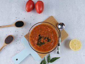 In a frying pan add cooking oil, tomatoes & mix well,cover & cook until tomatoes are soft (10-12 minutes).Let it cool then transfer to blending jar & blend to make a puree then set aside.