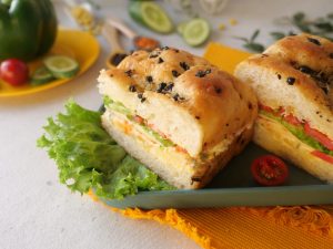 Cut focaccia bread from center and apply butter on both sides of bread.