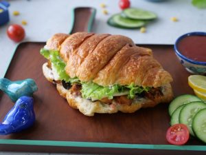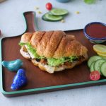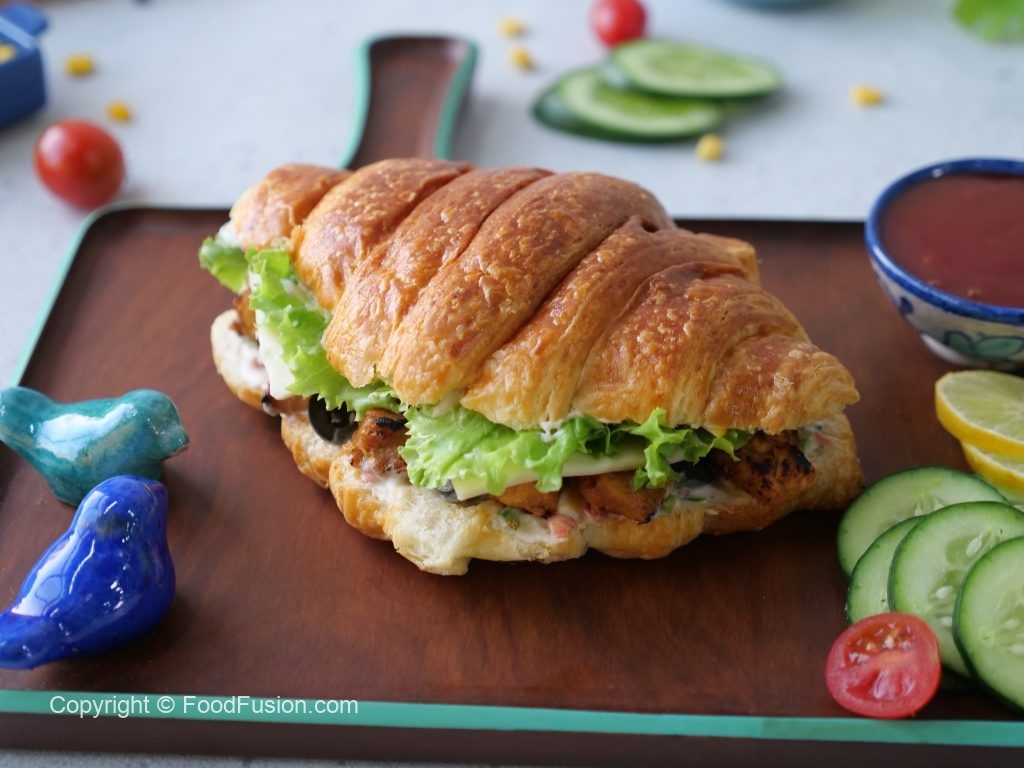 Cut croissant in half,add & spread prepared spread on both sides,add leftover chicken tikka,black olives slices,cheese slices,lettuce leaves,flip another bread slice to make a sandwich (makes 2-3 sandwiches) & serve!