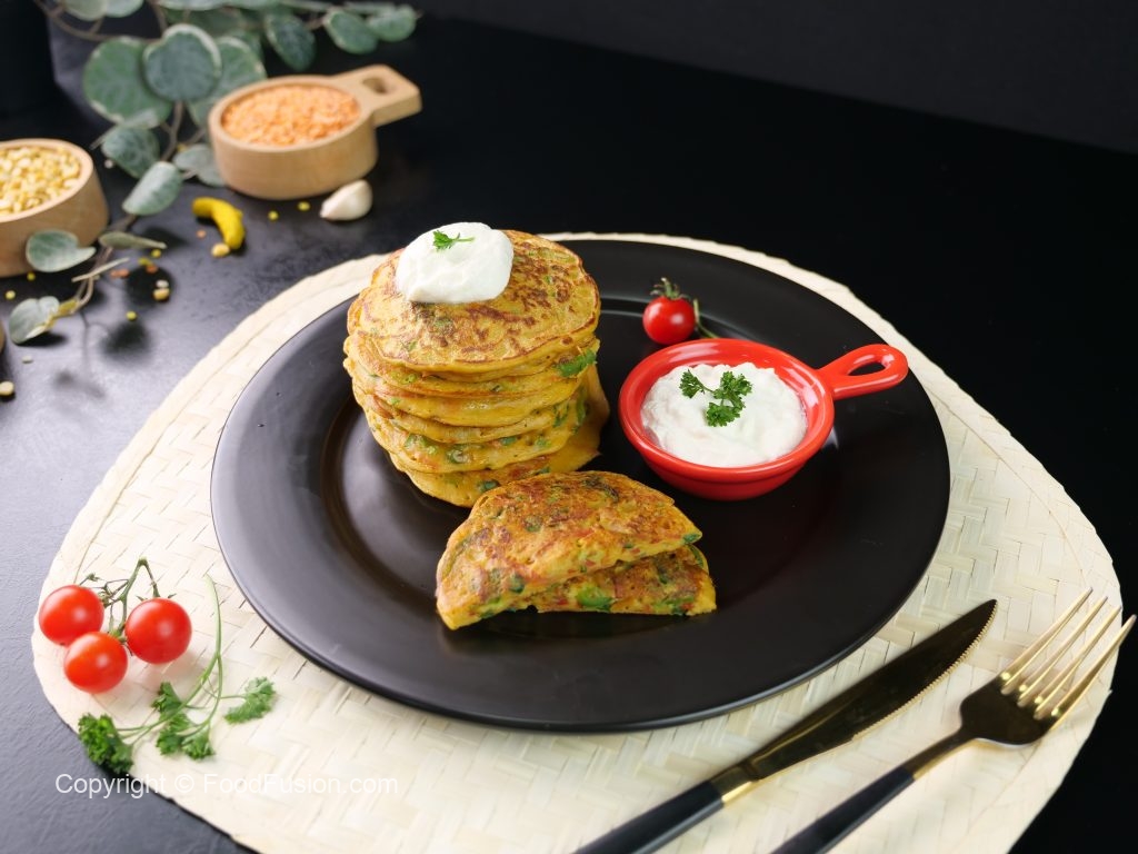 -On a greased frying pan,add ¼ cup of batter & cook on low flame for 2 minutes,flip & cook other side until done (makes 9-10).