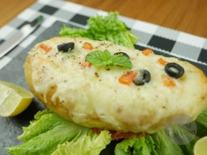 -Pita/shawarma bread per pizza sauce dal ker pheela lein,cooked chicken topping,shimla mirch,corn kernels,pyaz,cheddar cheese,mozzarella cheese & dried oregano dal dein.