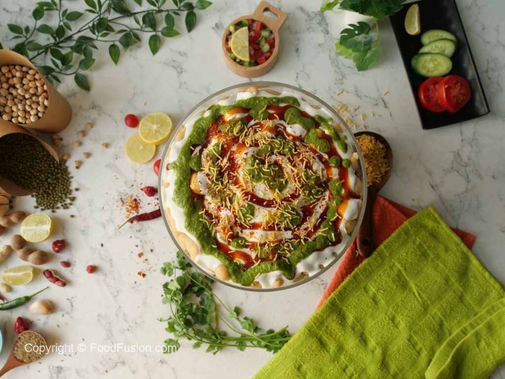 -Deep serving dish mein boiled chanay,chaat masala,lal mirch crushed,tayyar hari chutney,mixed vegetables salad,boiled aalo,tayyar meethi chutney,mong phali,sev nimco,tayyar dahi,meethi chutney,hari chutney,papri,boiled sabut mong daal,chaat masala,dahi phulkiyan,dahi,meethi chutney,hari chutney,lal mirch crushed aur sev nimco dal ker serve karein!