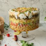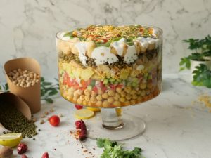 -In a deep serving bowl,add boiled chickpeas,chaat masala,red chilli crushed,prepared hari chutney, mixed vegetable salad,boiled potatoes,prepared meethi chutney,peanuts,sev nimco,prepared yogurt meethi chutney,hari chutney,papri,boiled whole green gram,chaat masala,dahi phulkiyan, yogurt,meethi chutney,hari chutney,red chilli crushed,sev nimco & serve!