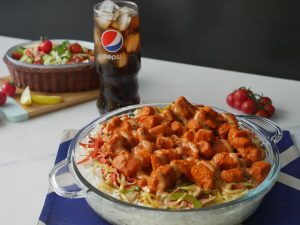 -In a serving platter, add prepared chaat and garnish with chaat masala powder, green chilli, fresh coriander & lemon then serve!
