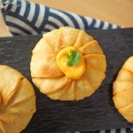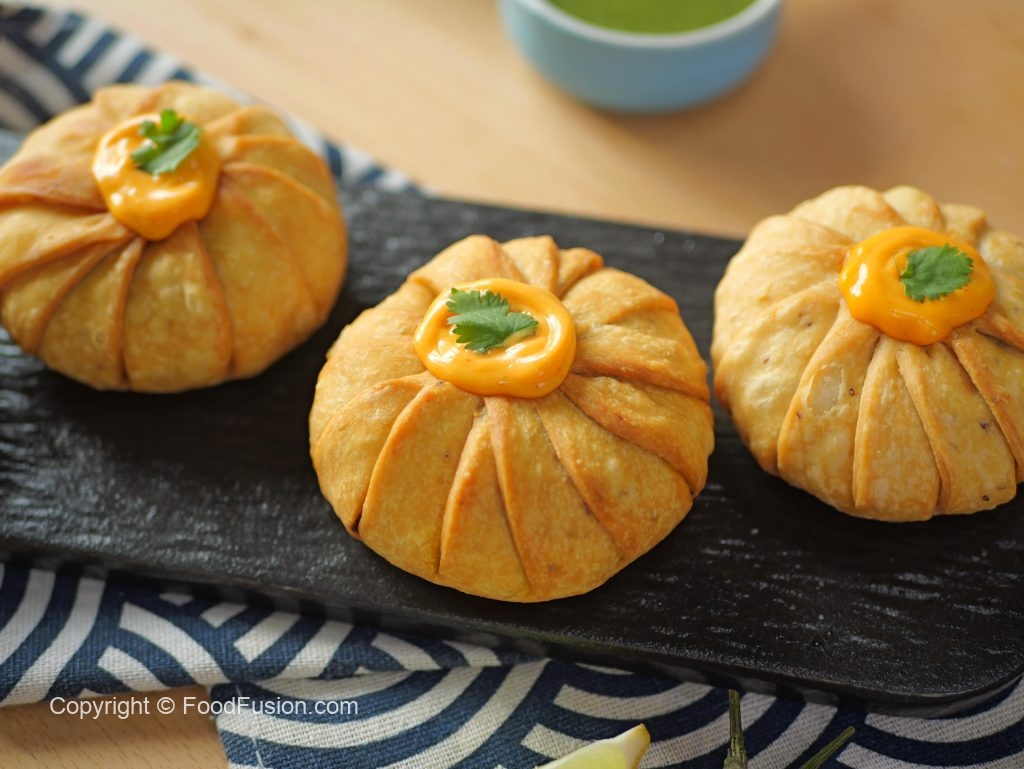-Roll out with the help of a rolling pin (5 inches), add potato filling (3-4 tbs), make cuts & wrap dough strips over potato filling & make potli shape samosa, apply slurry to seal it. (Makes 9-10)