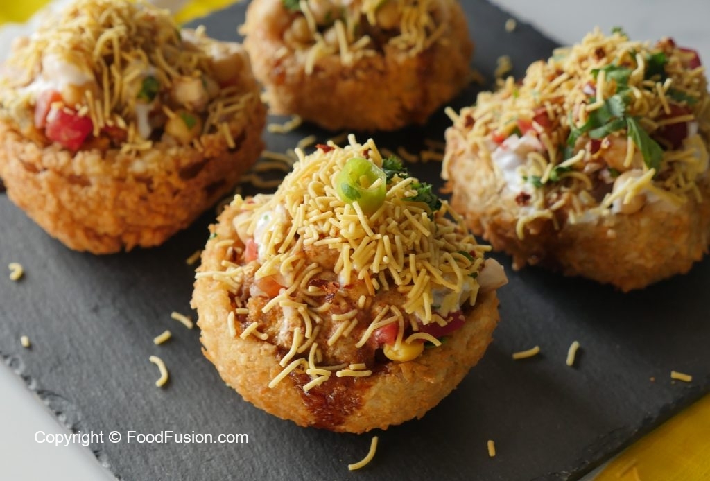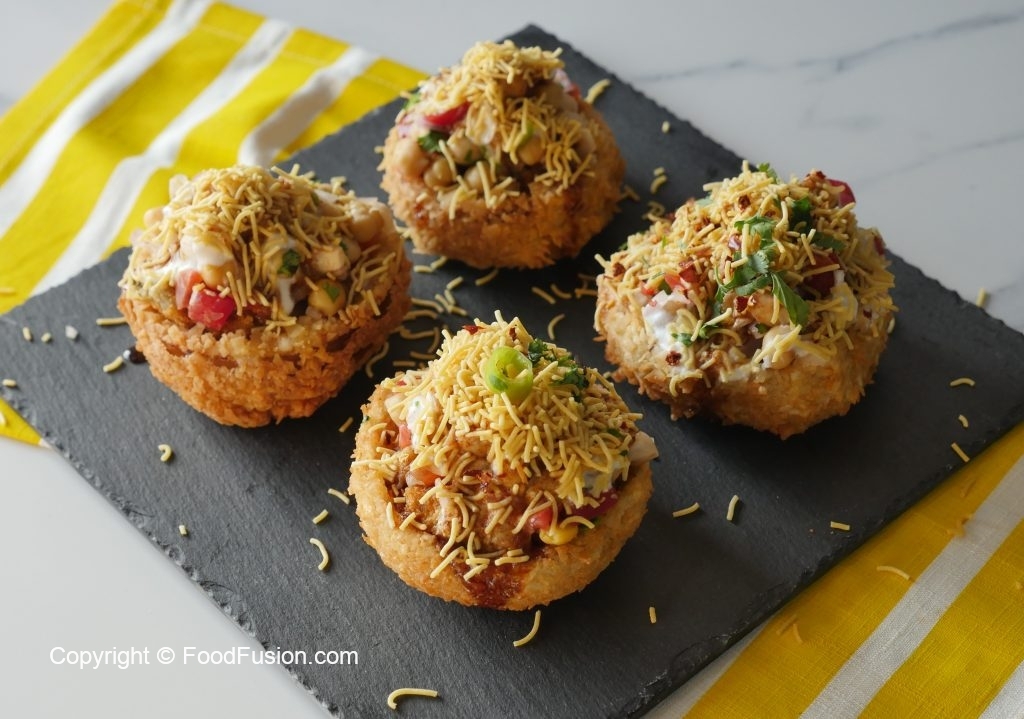 On onion cup,add aloo tikki pieces,chickpeas mixture,yogurt,khatti meethi chutney,nimco sev,red chilli crushed,fresh coriander & serve!