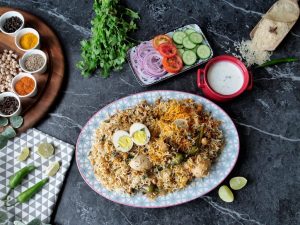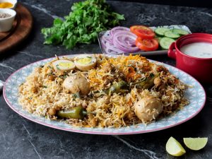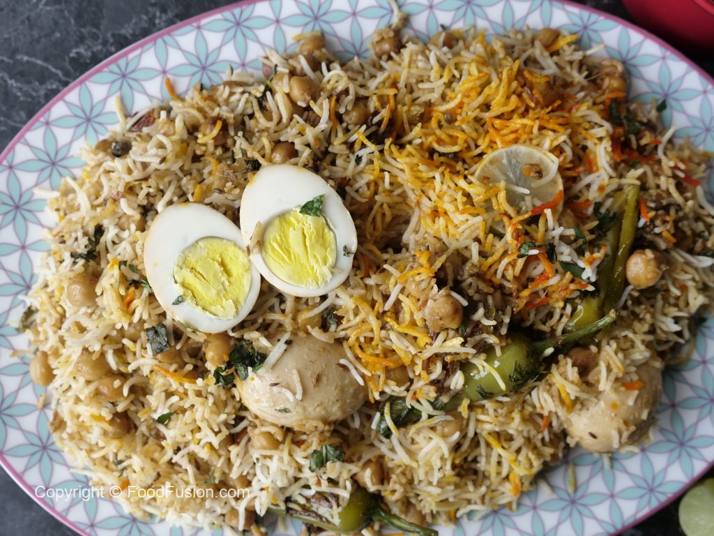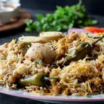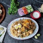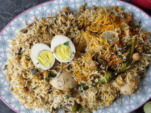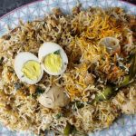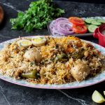 Add boiled rice,sprinkle orange food color,add fried onion,fresh coriander,mint leaves,green chilli, lemon slices and ghee,cover with kitchen cloth & lid,simmer on low flame for 15-20 minutes.