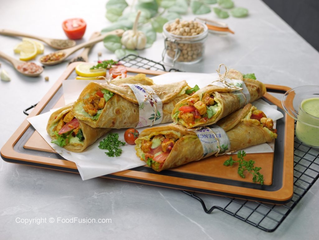-Add & spread prepared chana dahi sauce,add chicken filling,tomato,salad leaves & fold both sides.