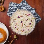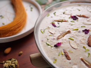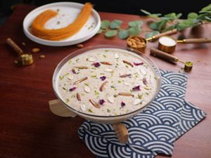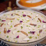 -In a serving dish, add badami sheer khurma, garnish with pistachio, almonds, dried rose petals & serve!
