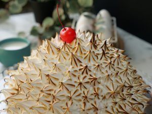 Apply thin layer of prepared meringue all over the cake and decorate with meringue flowers.