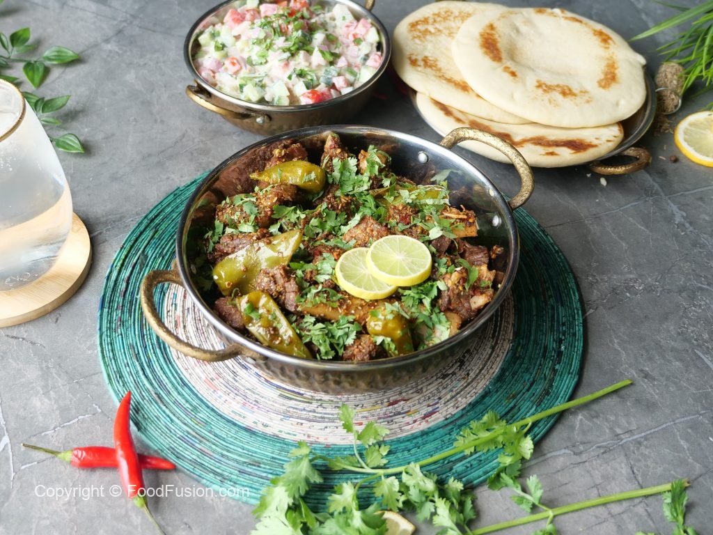 -Hari mirchon mein slit laga lein,karahi mein dal ker ache tarhan mix karein aur darmiyani ancch per 8-10 minutes kliya paka lein.