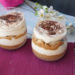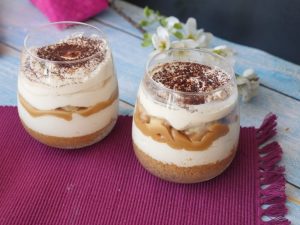 Add layer of cream mixture, Dulce de leche, banana slices, cream mixture, sprinkle cocoa powder on top.