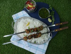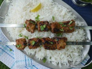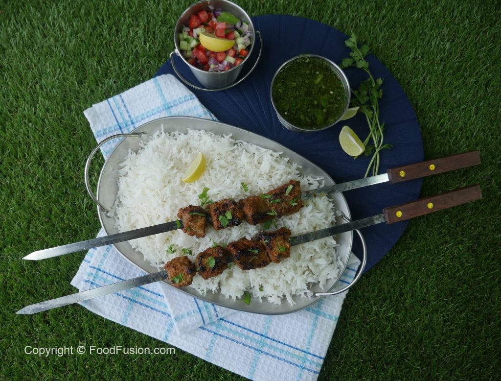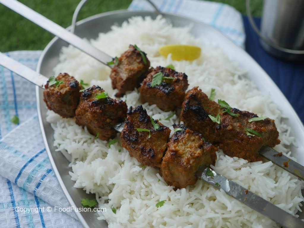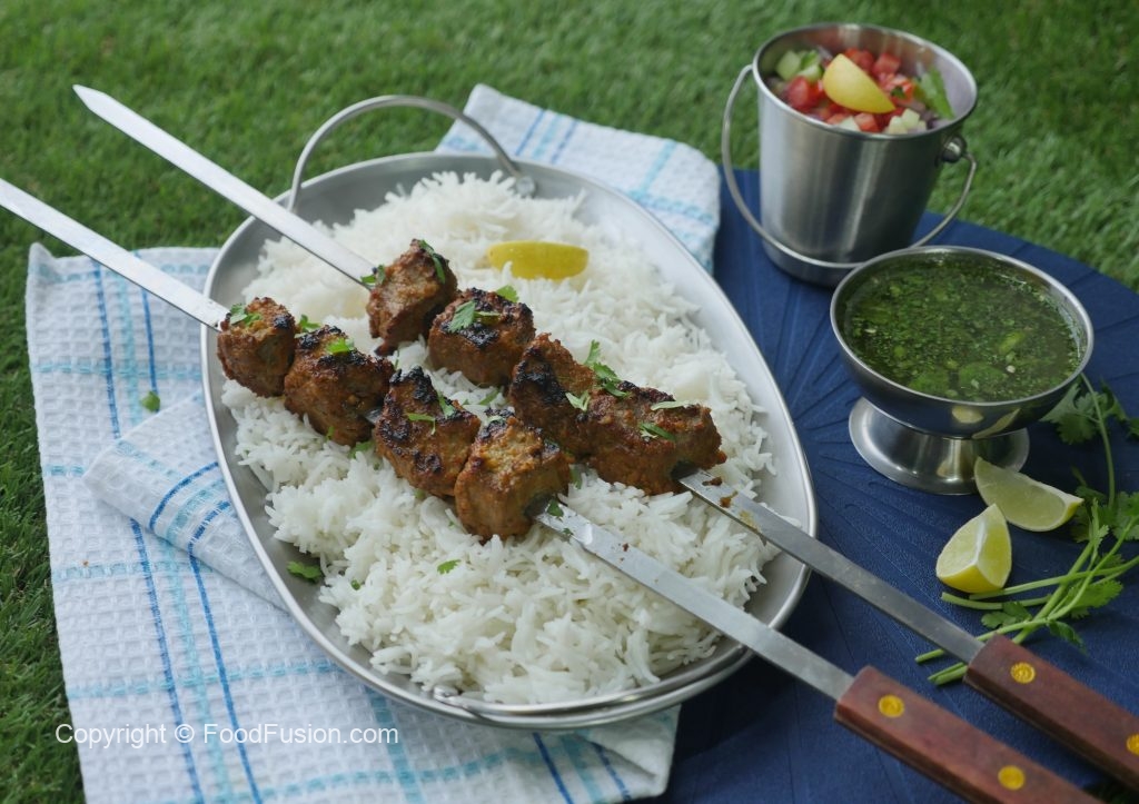 -Skewers ko (jaltay hoye koyla) bbq grill per tamam sides sa grill ker lein aur oil basting ker lein.
