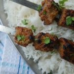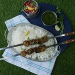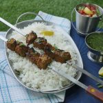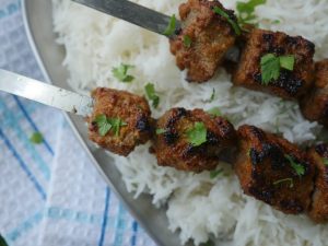 -Marinated meat ko skewers per laga lein.