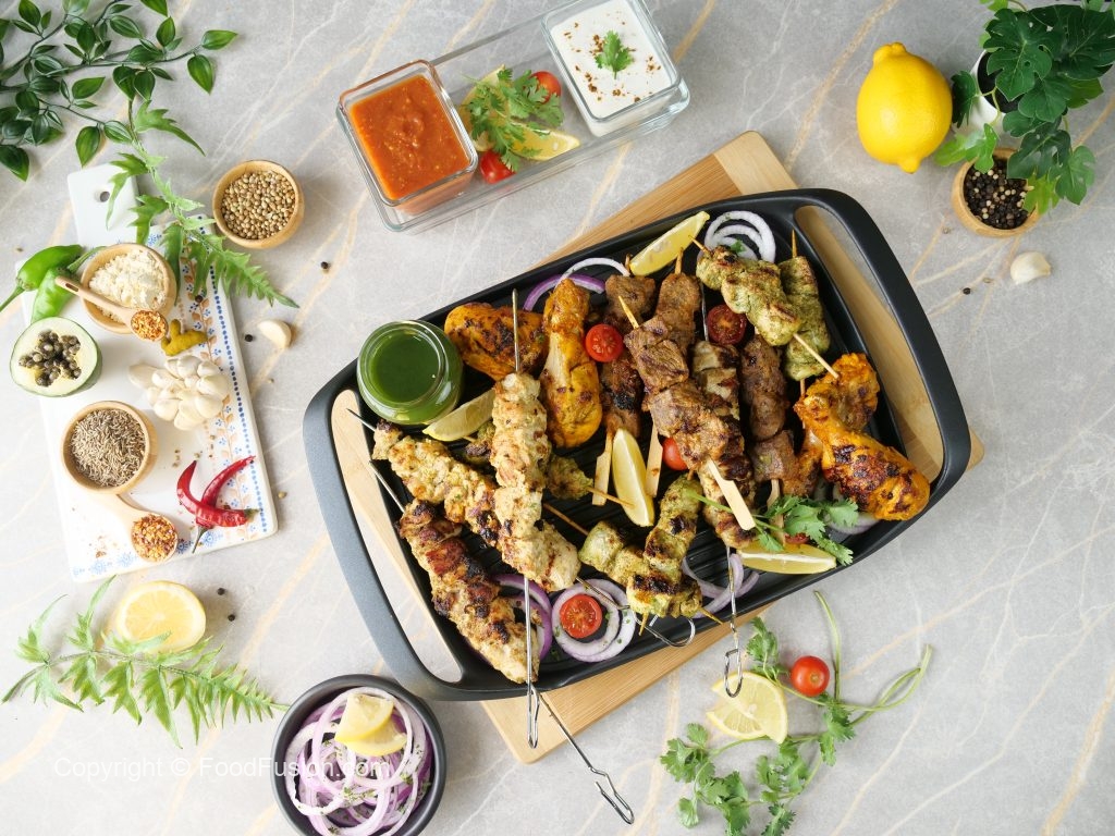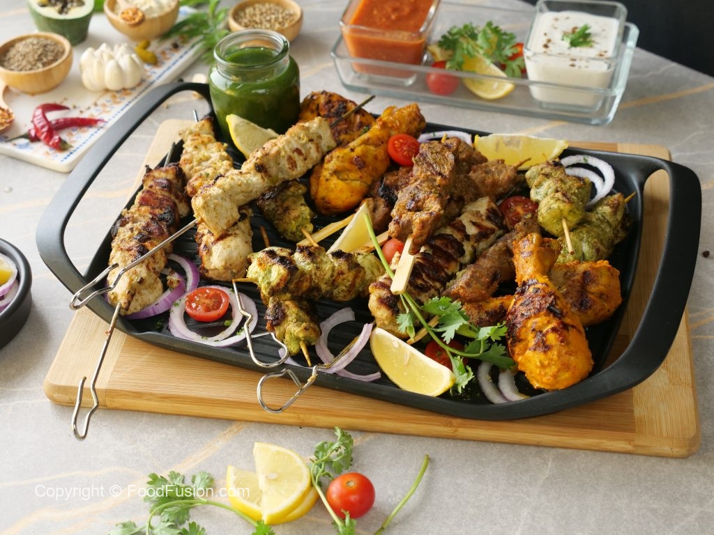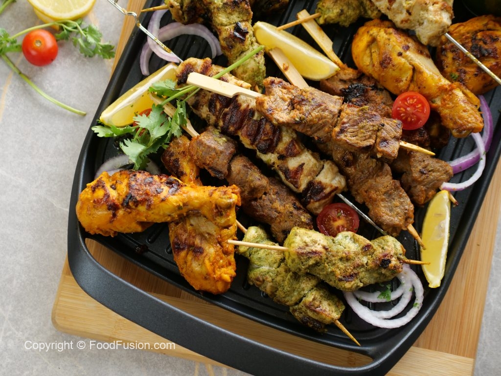 One marinade for a platter of four different BBQ recipes. You can make a delicious, full of variety bbq platter with less efforts easily. A little bit of everything in this BBQ KababPlatter #FoodFusion #HappyCookingToYou