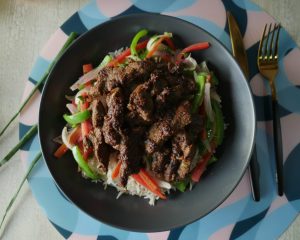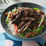 In serving dish,add cooked rice,stir fried vegetables,fried beef strips and drizzle prepared sauce and serve!