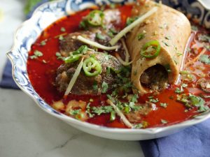 -Pour reserved oil (tarri) on nihari,garnish with green chillies,fresh coriander,ginger & serve with naan!