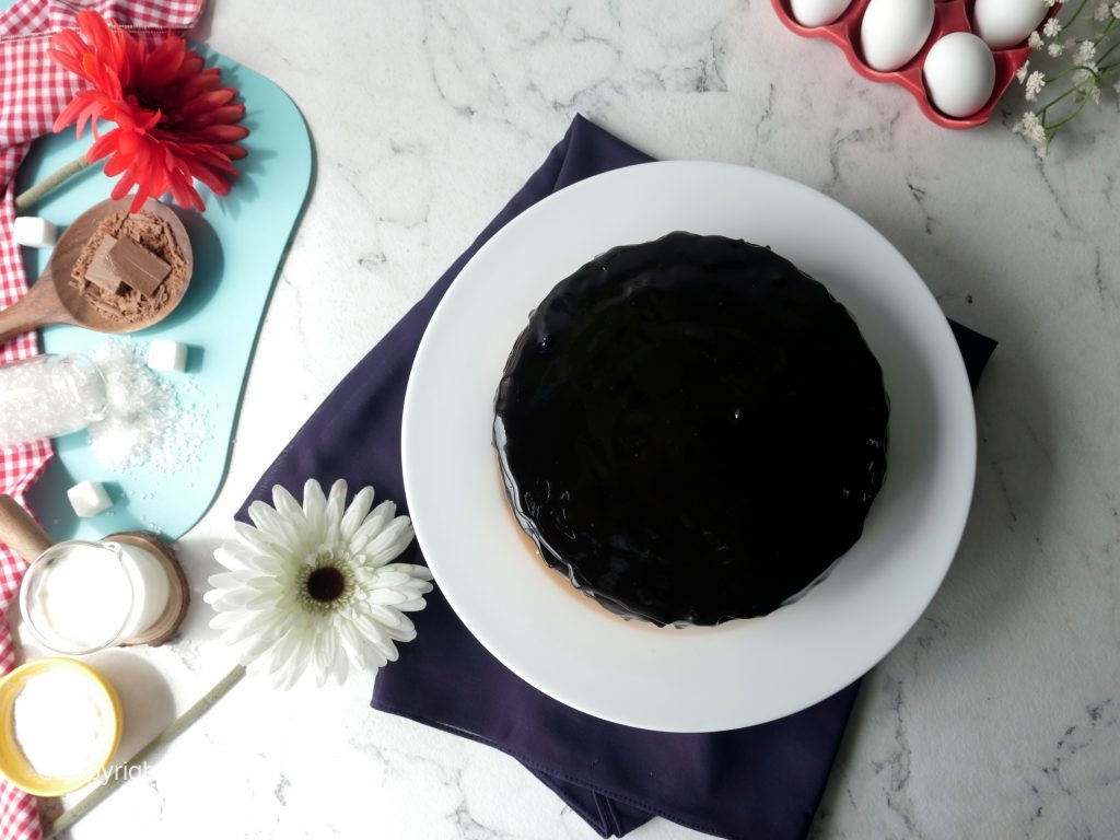 Now pour prepared chocolate ganache onto the top of cake & refrigerate until chilled.
