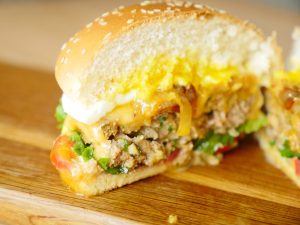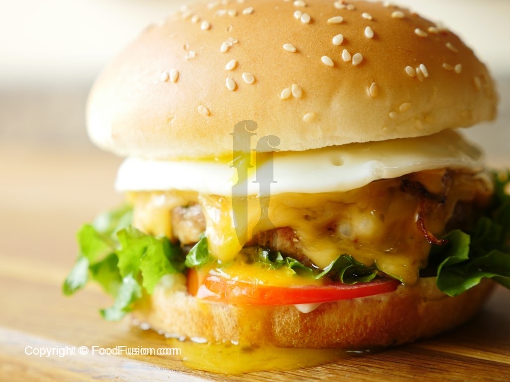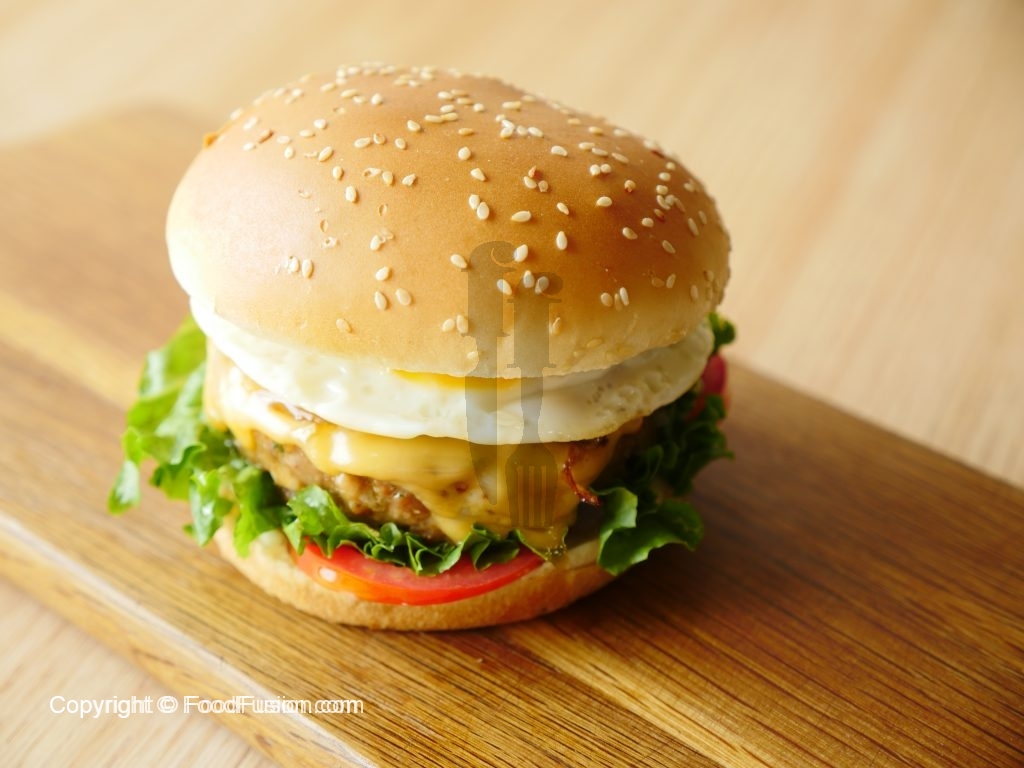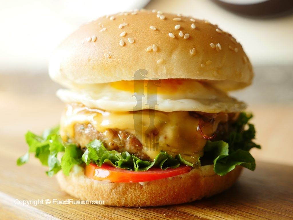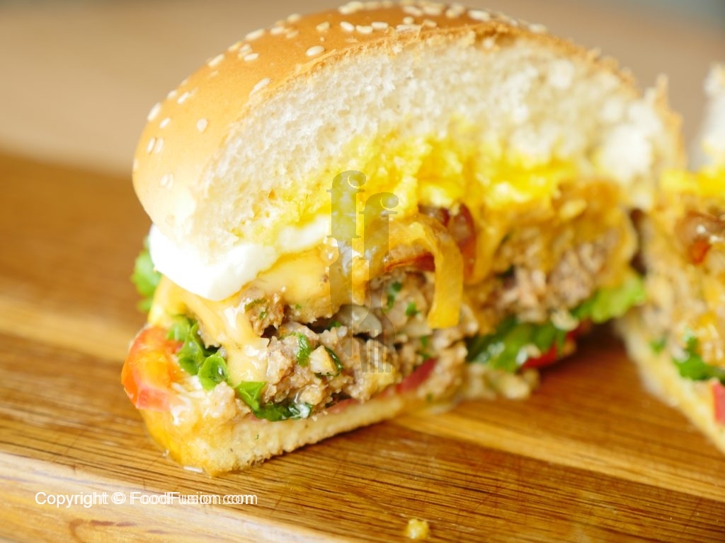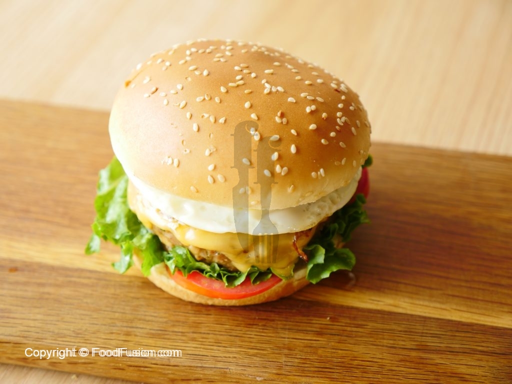 Burger bun mein mayonnaise laga lein,tamatar,salad patta,burger patty,caramelized onion aur fried anda dal dein aur top bun rakh dein.