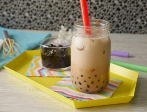 Serving or mason jar mein tayyar boba pearls syrup ka saath dal dein aur jar ko roll ker ka wall per melts sugar ko coat ker lein,chocolate syrup,ice cubes aur tayyar milk creamer dal ker stir ker lein aur serve karein!