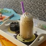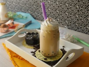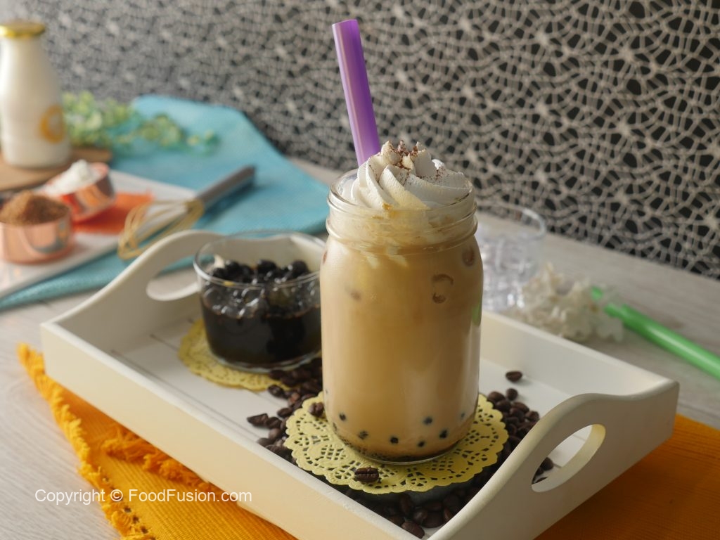 Serving or mason jar mein ice cubes,tayyar boba pearls syrup ka saath dal dein,tayyar black coffee aur milk creamer dal dein,whipped cream aur cocoa powder dal ker serve karein!