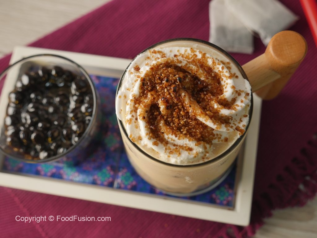 Serving or mason jar mein ice cubes,tayyar boba pearls syrup ka saath dal dein,tayyar black tea aur milk creamer dal dein,whipped cream aur brown sugar dal dein aur blow torch sa burn ker ka serve karein!