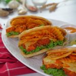 -On paratha,add prepared butter chicken sauce,salad leaves,chicken filling with cheese,chips,prepared butter chicken sauce & cover with another paratha (makes 4) & serve!
