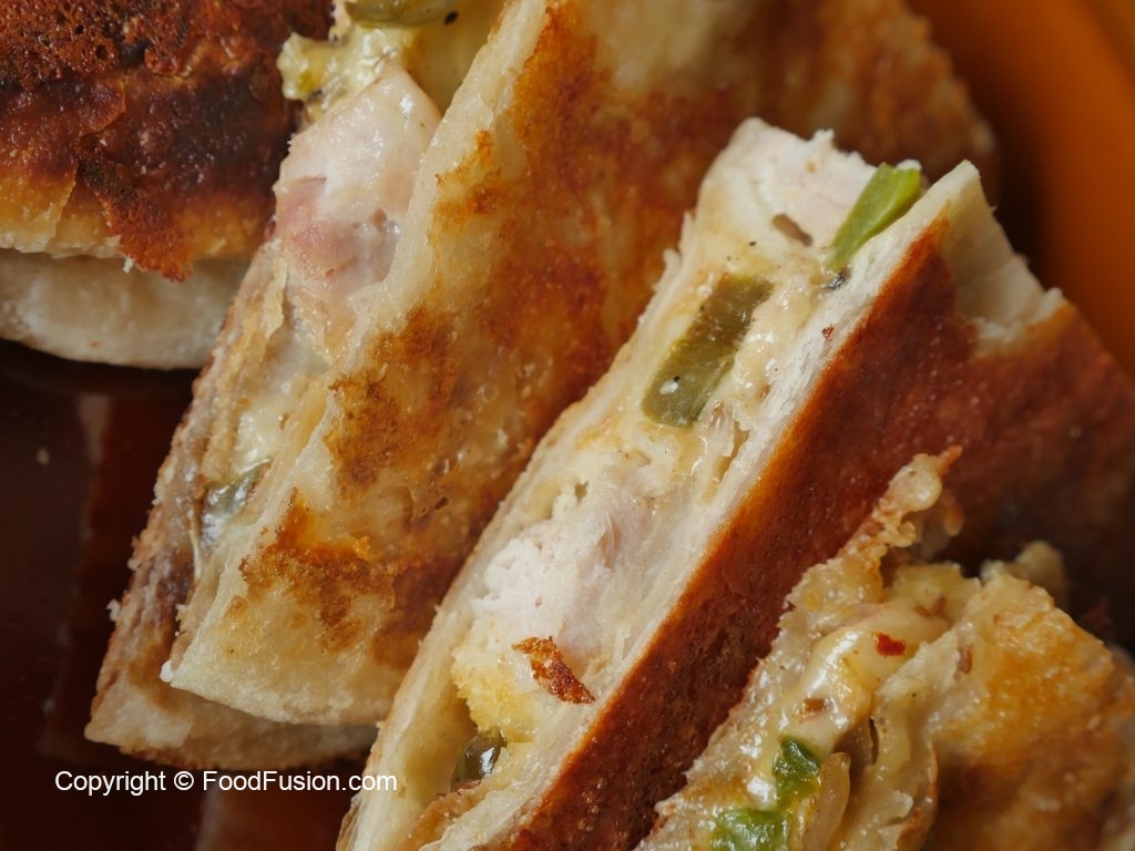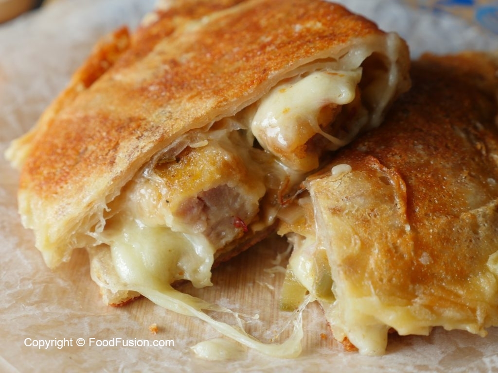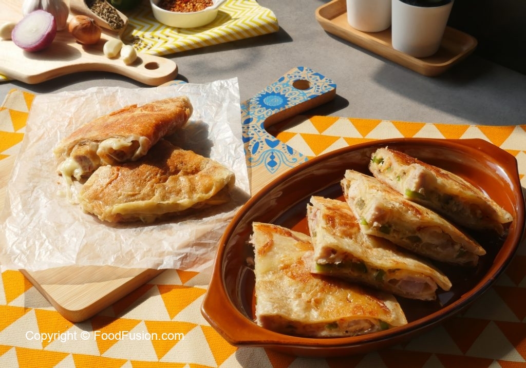 Tawa per mozzarella cheese aur cheddar cheese dal ker pheela dein,cooked paratha rakh ker upper sa cheddar cheese,mozzarella cheese,cooked vegetables,fried fish pieces,mozzarella cheese,cheddar cheese aur lal mirch crushed dal dein.