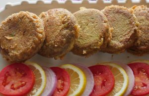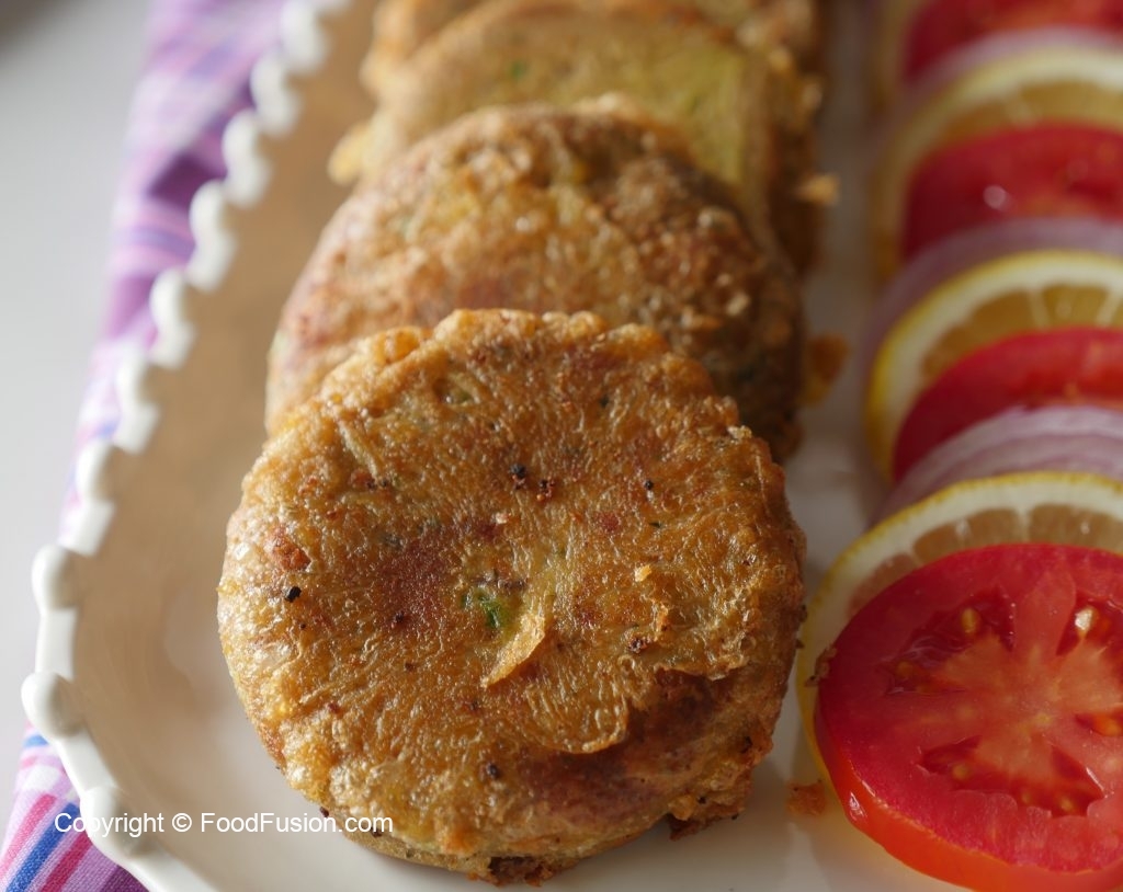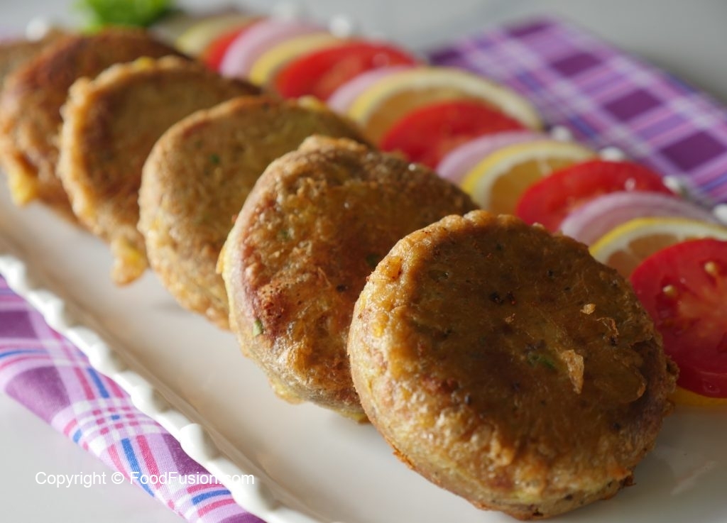 Grease hands with oil,take a mixture (65g) and flatten on your palm,add cheese filling and make kabab of equal sizes (makes 34-35).