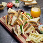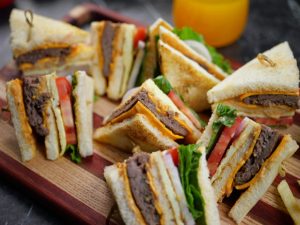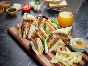 -On one bread slice,place salad leaf,tomato,onion,prepared omelet,place another bread slice,cheese slice,patty with cheese slice & cover with another bread slice.