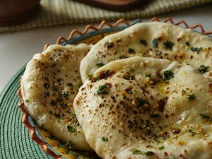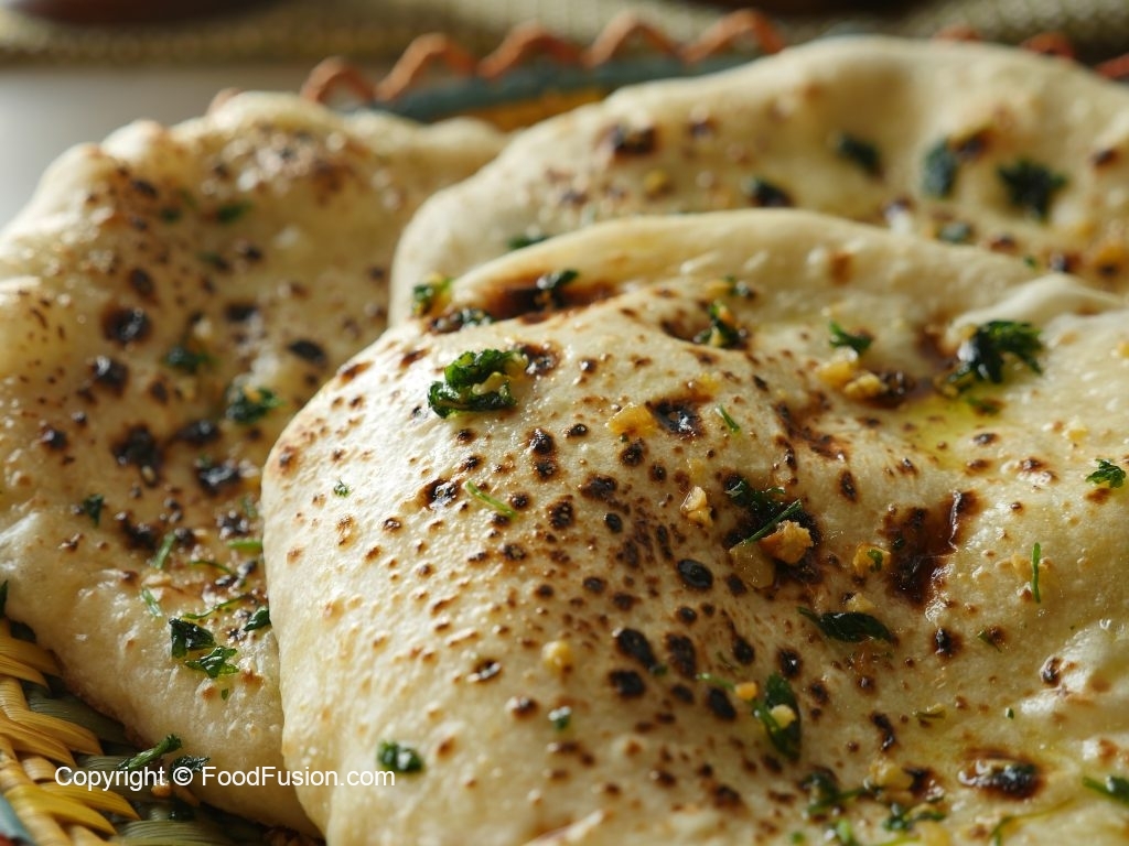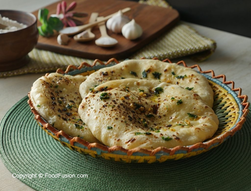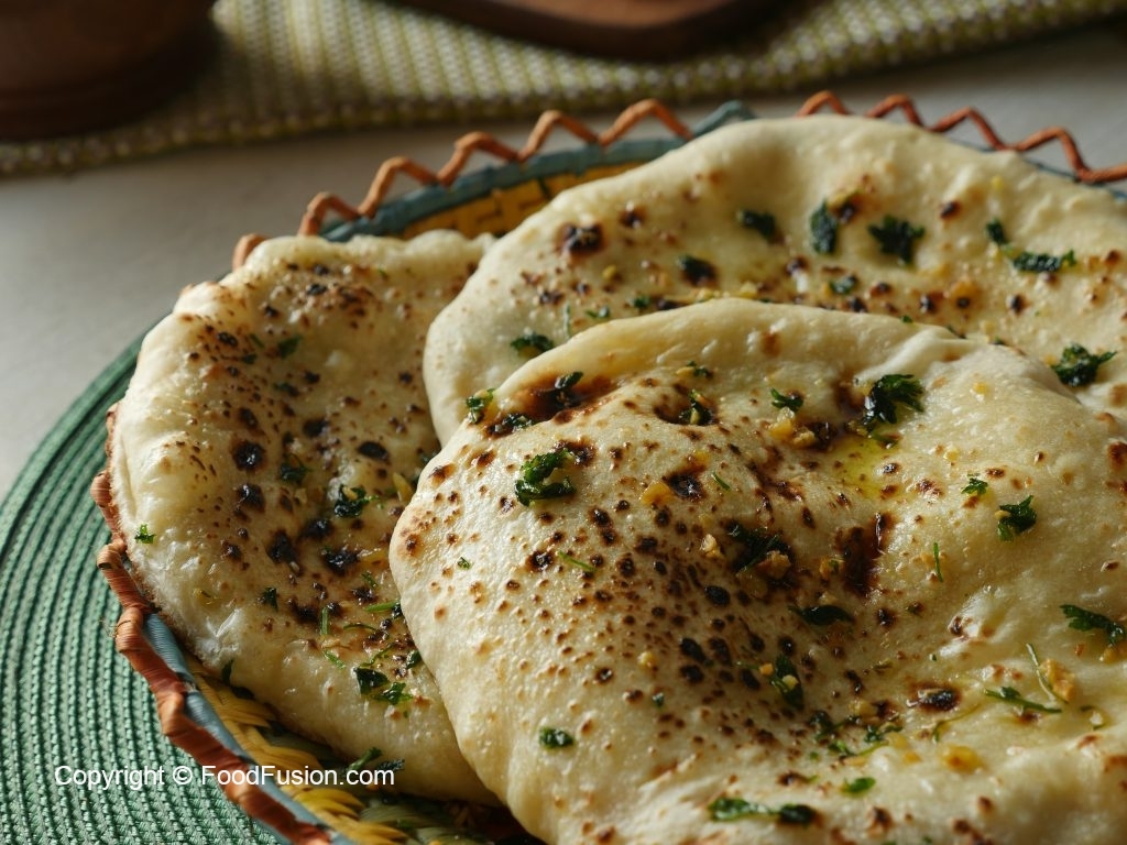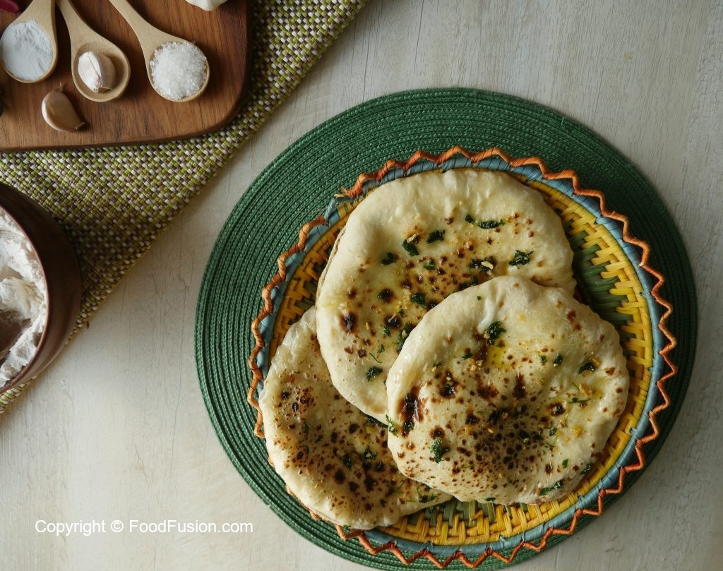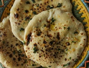 Tawa ya iron pan garam karein aur naan (wet side down) ko halki ancch per paka lein yahan tak ka bubbles ajayein aur bottom sa brown ho jayein phir tawa ko flip karein aur dosri side ko directly chulay per brown or charred hunay tak paka lein.