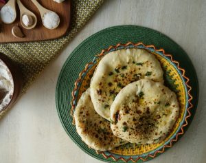 Add prepared cheese filling (2-3 tbs) and fold all edges to seal the filling then prick with skewer and roll out gently with the help of rolling pin and apply water on naan (makes 4).