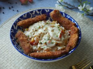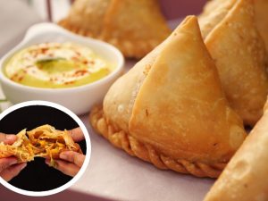 Bowl mein cheddar cheese,mozzarella cheese,hara dhania aur lehsan dal ker ache tarhan mix karein & side per rakh dein.