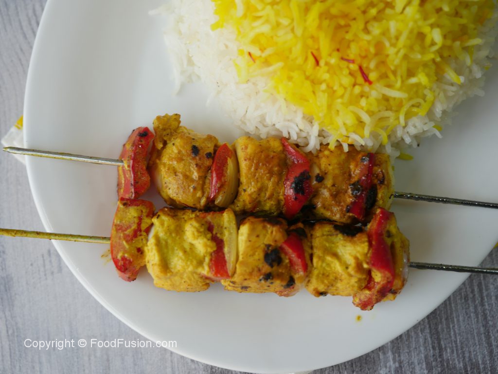 Thread onion,red bell pepper and chicken boneless cubes into skewers and basting with the remaining marinade (makes 10-12).