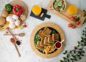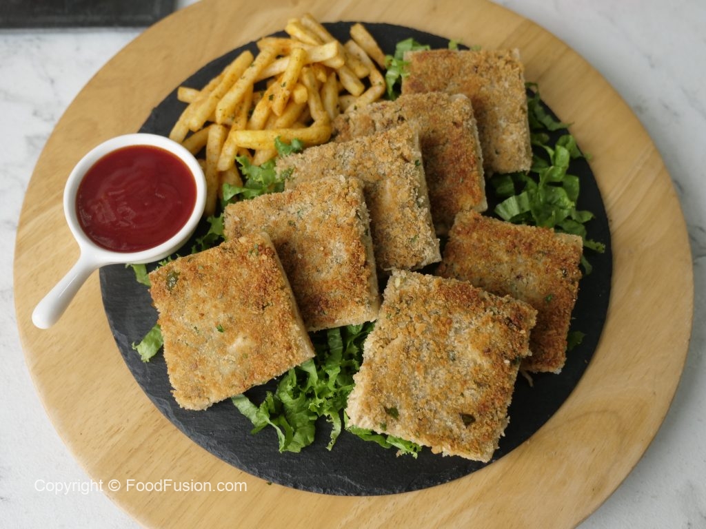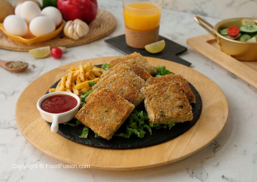 Four piece mein cut ker lein aur bread slice ki potato side ko breadcrumbs sa coat ker lein (makes 8 bread slices).