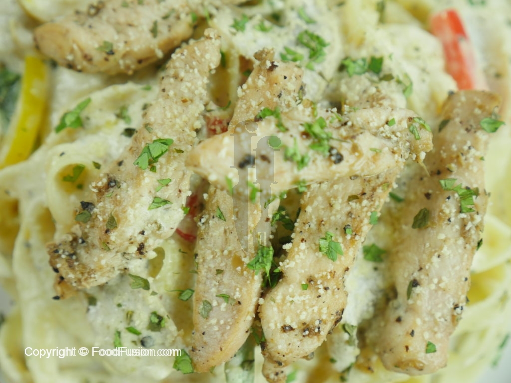 Plating ke liye pehle pasta set karein, phir sauce daalein, chicken daalein aur akhir main parmesan cheese aur parsley se garnish karein.