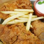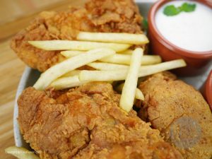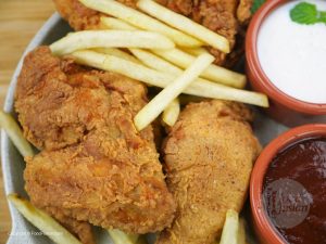Once chicken completes its marinating time, coat the chicken in flour mixture, then dip in beaten eggs and milk mixture and again coat in flour mixture. Do not keep for long and asap place in oil for frying. Fry on low-medium heat and do not turns around too much the coating may break.