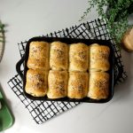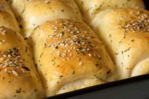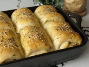 7.5 X 11” baking pan ko tayyar herbed butter sa grease ker lein,dinner rolls rakh dein aur dhak ker 20-25 minutes kliya proof ker lein.