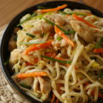 Chow mein or egg noodles,yakhni,namak aur hara pyaz dal ker 2-3 minutes kiya tez ancch per stir-fry ker lein.