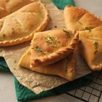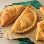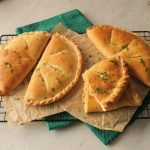 -On baking try (greased with cooking oil and lined with butter paper),place rolled dough,on half side of the dough,add chicken filling,apply water and fold the other side over it,press and apply water and seal the edges.
