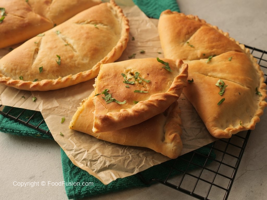 -Baking tray (greased with cooking oil and lined with butter paper) per rolled dough rakh dein,dough ki ek side per chicken filling dal dein,edges per pani laga lein aur dosri side ko fold ker lein,press ker ka pani laga lein aur edges ko seal ker lein.