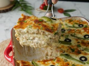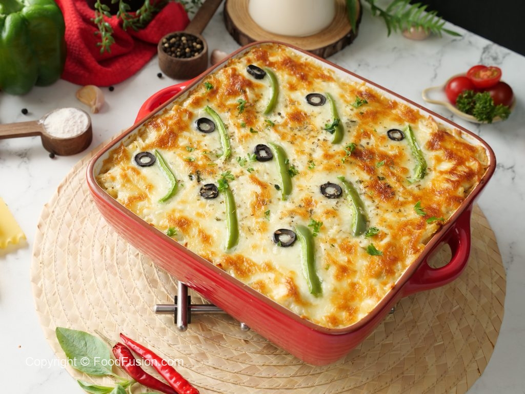 -Place lasagna sheets,add prepared chicken filling,olive oil,prepared creamy white sauce,fresh parsley,cheddar cheese,mozzarella cheese,lasagna sheets,prepared chicken filling,olive oil,prepared creamy white sauce,fresh parsley,cheddar cheese,mozzarella cheese,lasagna sheets,prepared chicken filling,olive oil,creamy white sauce,fresh parsley,cheddar cheese,mozzarella cheese, capsicum,black olives & sprinkle dried oregano.
