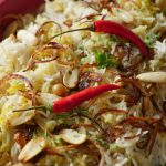 Serve mandi with mandi rice,mandi sauce and garnish with fried onion,fried almonds and fresh coriander.