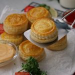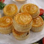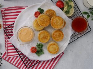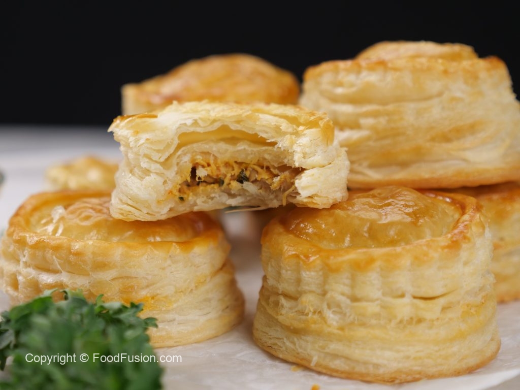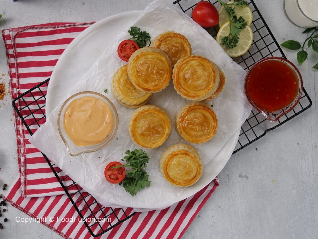 -Apply water,add prepared chicken filling in the center & flip another puff pastry on top to make a patties.