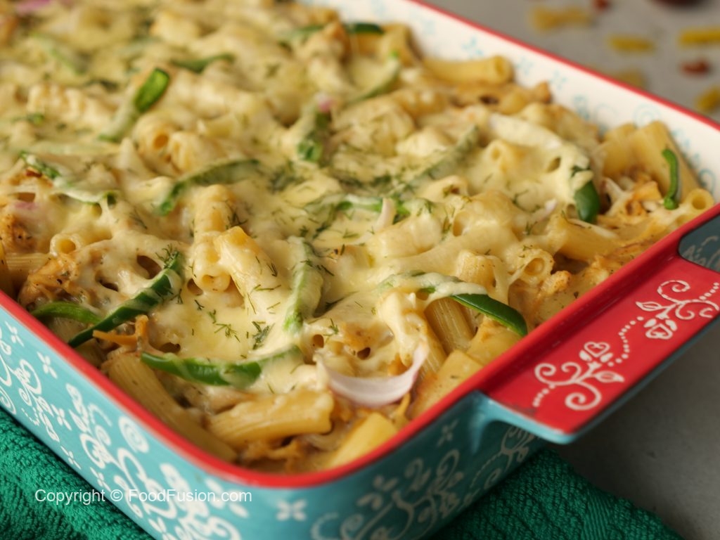 Remove from heat,add boiled pasta,shredded chicken,prepared ranch sauce,onion,capsicum,dill & mix well.