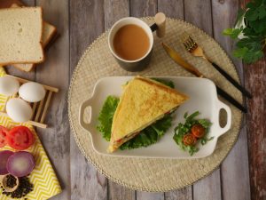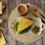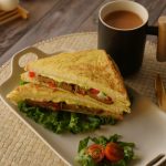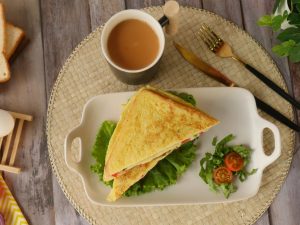 Add onion,tomato,green chilli,fresh coriander and cheese slice and flip the other bread slice over it,press gently & cook on low flame until cheese melts.