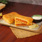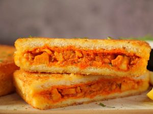-Add prepared chicken tikka mixture, spread it, cover with another bread slice, press with spatula.