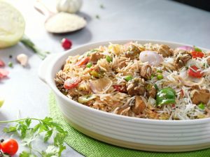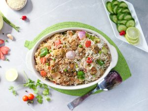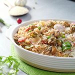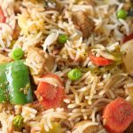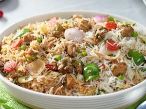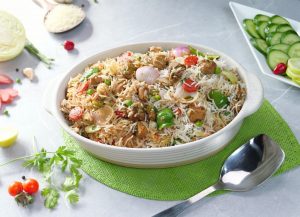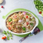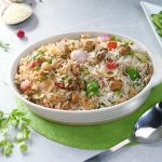 -Add half quantity of boiled rice,chilli sauce,green chilli sauce,soy sauce,chicken & veg gravy,remaining boiled rice,spring onion green leaves,cooking oil,cover & cook on low flame for 8-10 minutes & serve!