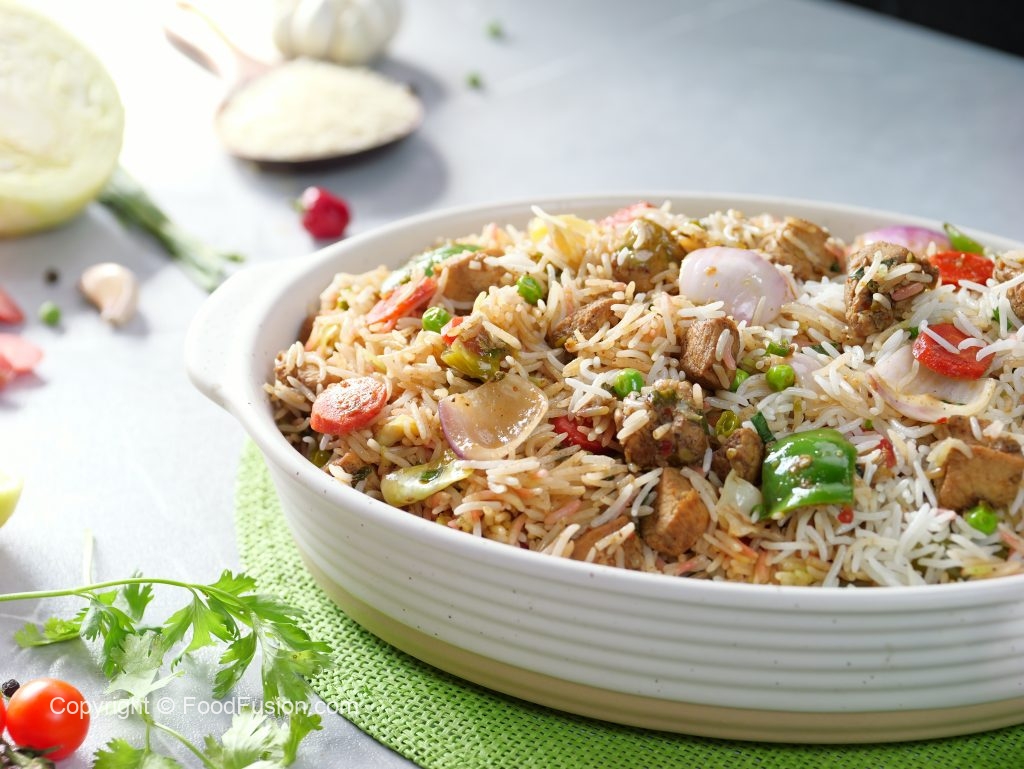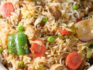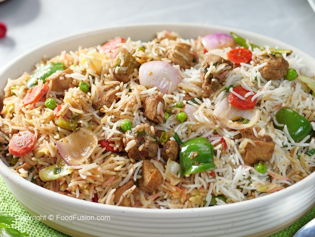 -Boiled rice ki half quantity,chilli sauce,green chilli sauce,soy sauce,chicken & veg gravy,remaining boiled rice,hara pyaz leaves aur cooking oil dal ker dhak dein aur halki ancch per 8-10 minutes kliya paka lein & serve karein!