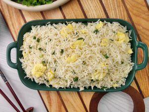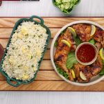 -Serve chicken tikka with egg fried rice.
